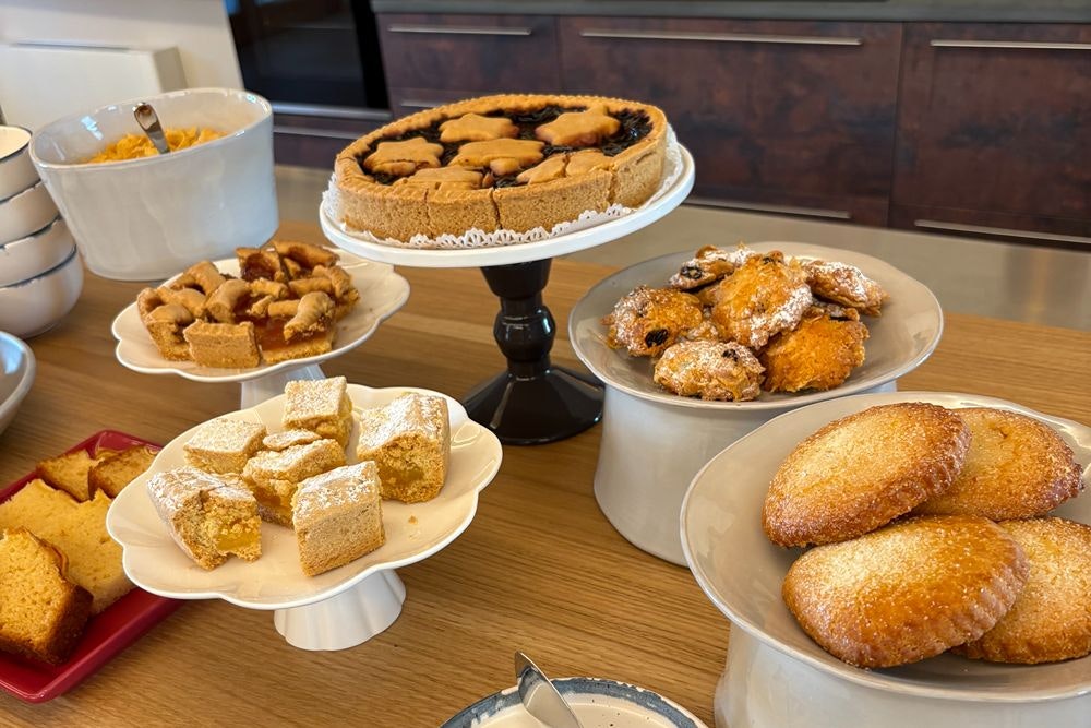El desayuno de lujo: cada mañana nos esperaba una mesa digna de fotografía: quesos frescos de la región, pan artesanal, pastries, yogur casero, prosciutto di Parma y frutas recién cosechadas.
