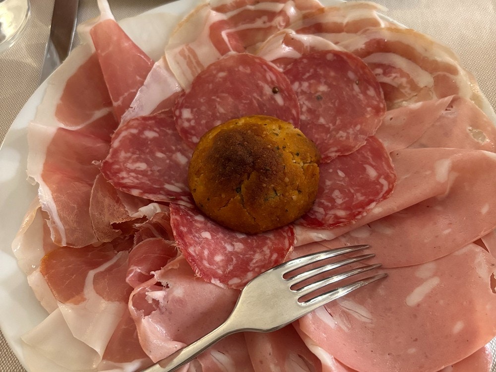 De entrada: un plato de mortadella, salmis y prosciutto con queso de Puglia, perfecto para abrir el apetito.