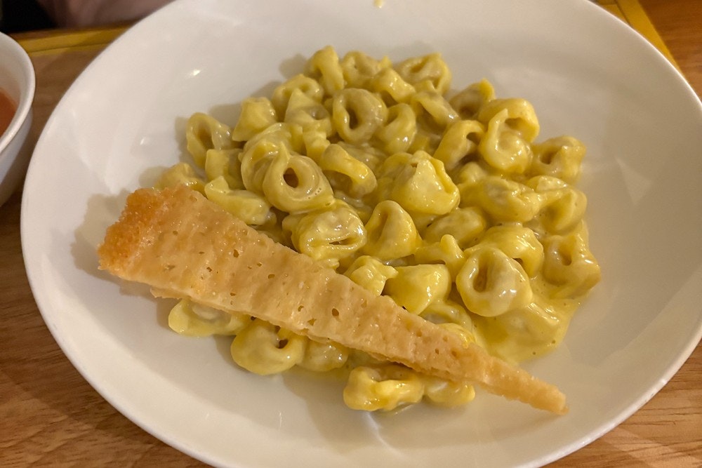 También probamos el tortellini en salsa de queso pero tampoco estuvo a la altura. Unos tortellinis sabían delicioso, pero otros estaban mal cocidos, parecían crudos.