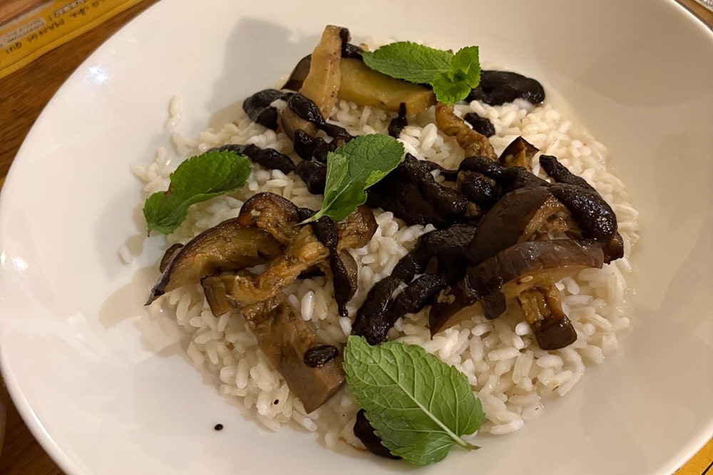 Pedí un risotto que me pareció un completo desastre. Era un simple puñado de arroz sin sabor con cuatro tiras de berenjena por encima.