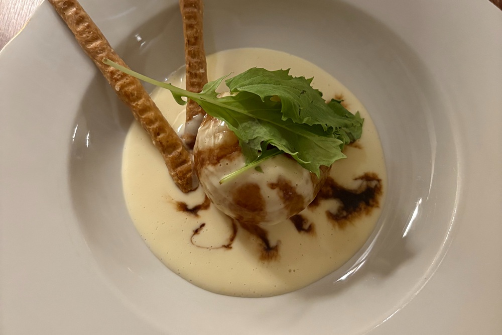 De entrada probamos algo muy original y yo me sentí como toda una foodie. Cebolla asada en salsa de Parmigiano Reggiano (24 meses de maduración) y jarabe de mosto de uva.