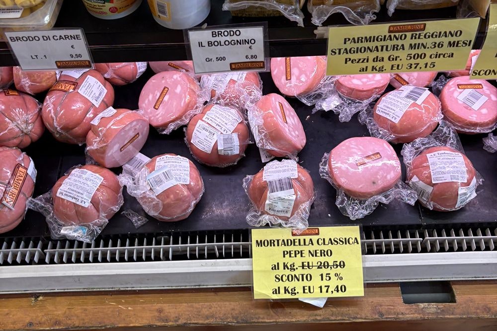 La mortadella tiene siglos de historia: ya en la época romana existía un producto parecido, y en el siglo XVII se establecieron las primeras reglas oficiales para su elaboración en Bolonia. Está hecha con carne de cerdo finamente molida, lo que le da esa textura lisa y cremosa, muy distinta a los embutidos granulados.